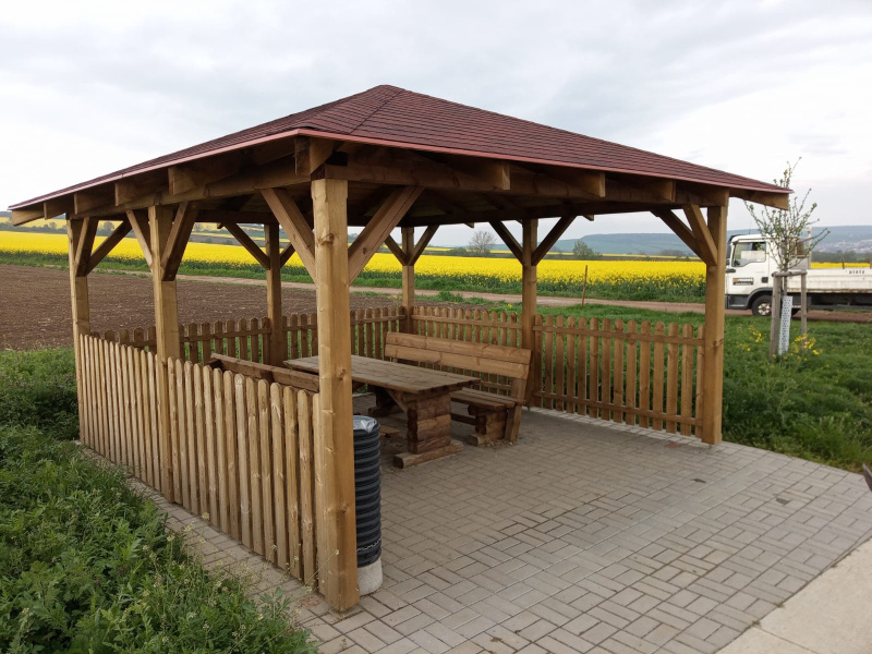 Tento altán u cyklostezky je opatřen ze třech stran zábradlím v podobě deskových plotovek a součástí byla také dodávka sedací soupravy. Proběhlo oplechování střechy bez přidání okapů a svodů. Materiál je vakuotlakově impregnován, kdy postupně dochází k světlání barvy vlivem počasí.