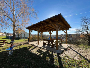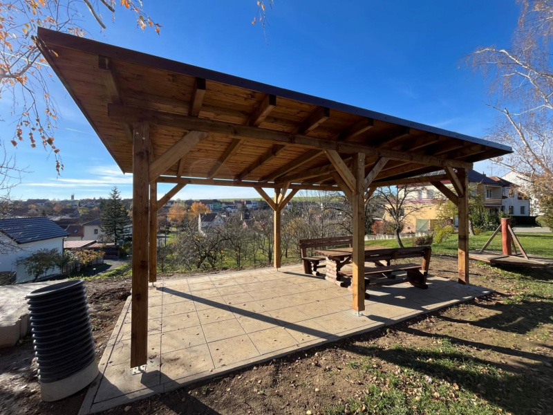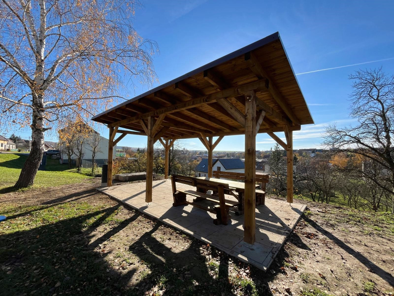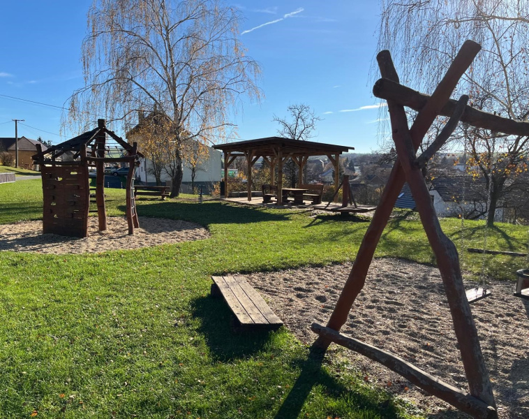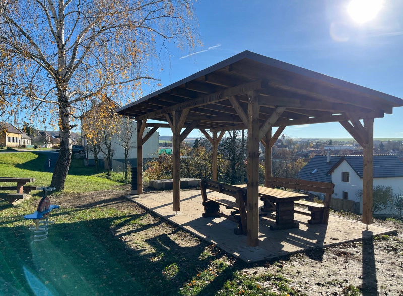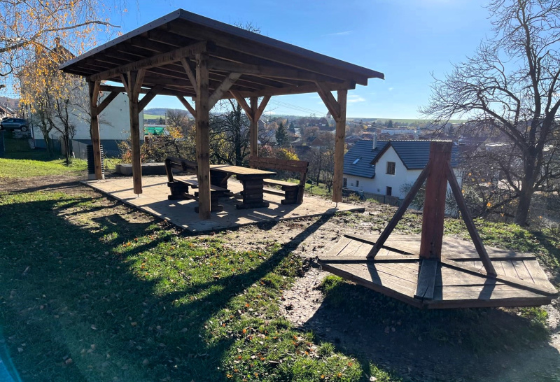 V obci se nachází nespočet dětských hřišť, toto v ulici Záhumní však nyní bude mít zastřešené posezení. Realizace proběhla v roce 2025 a součástí dodávky byla také sedací souprava.
