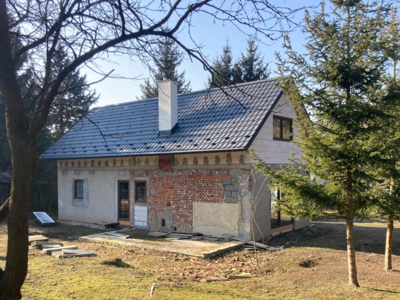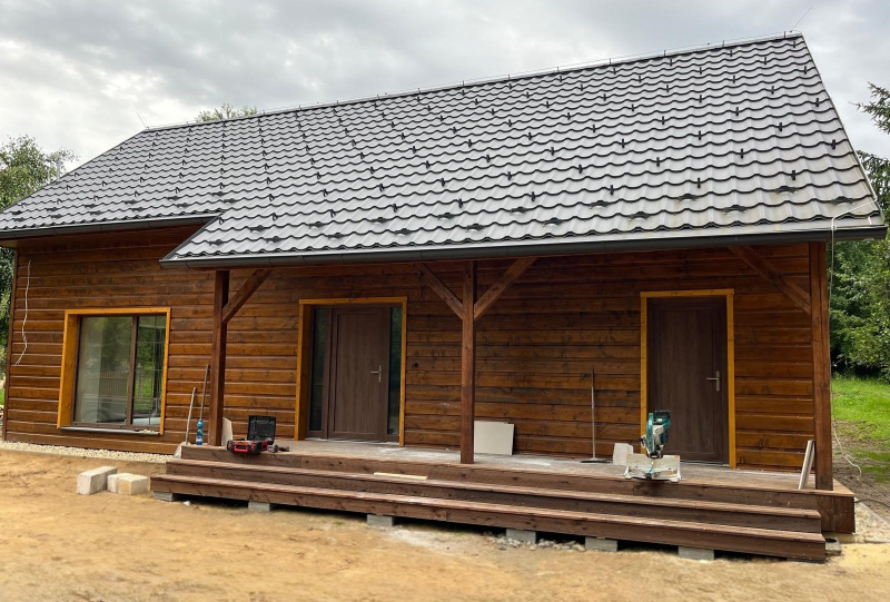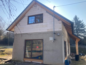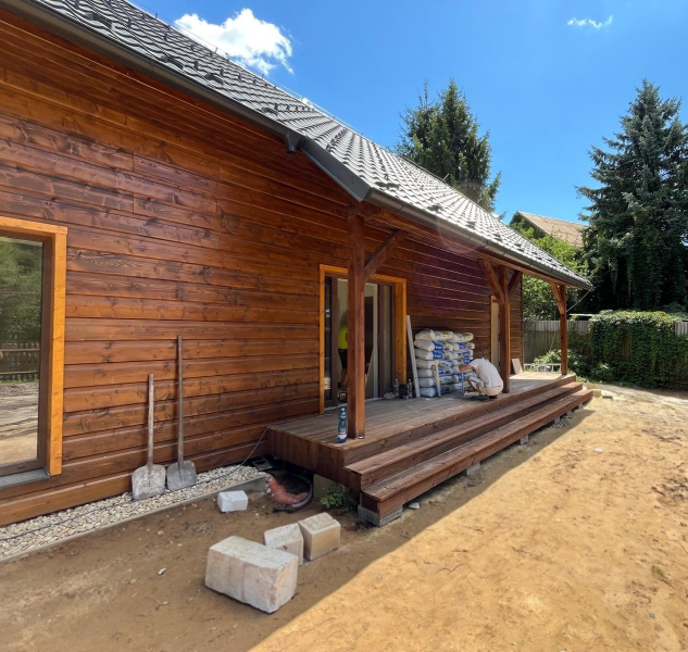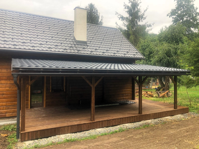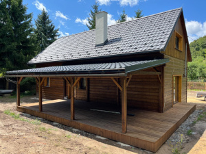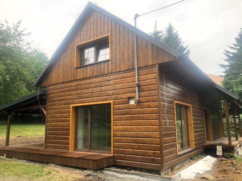 Tato realizace spočívala v obložení a zateplení chaty (nebo rodinného domu?) zákazníka tzv. „valašským“ obkladem. Zároveň jsme postavili terasu s přístřeškem a z druhé strany pak provedli montáž schodů.
